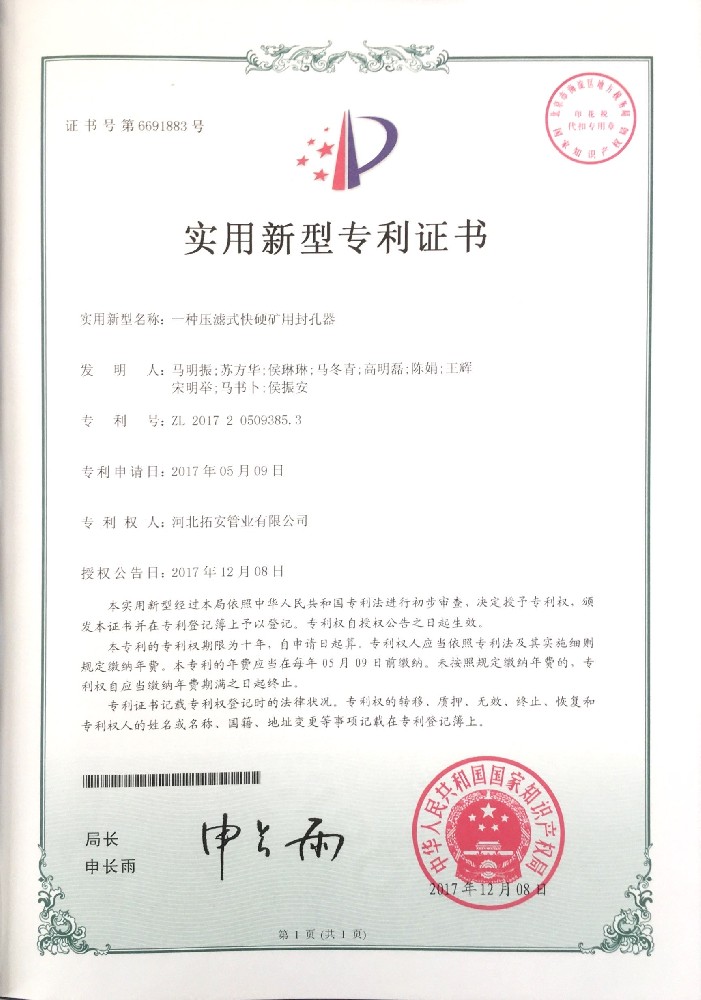 一种压滤式快硬矿用封孔器证书