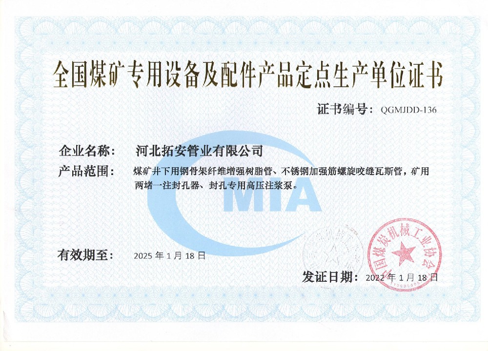 全国煤矿专用设备及配件产品定点生产单位证书