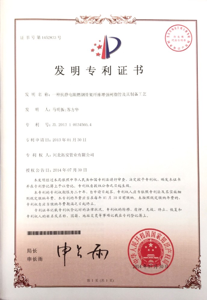 一种抗静电阻燃钢骨架纤维增强树脂管及其制备工艺证书