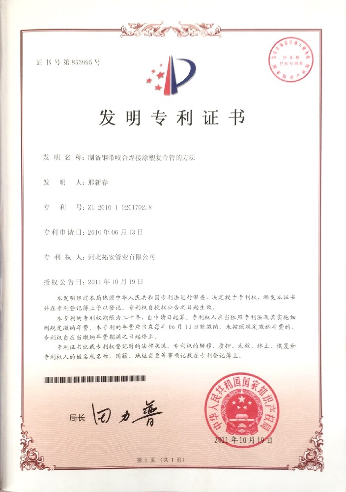 制备钢带咬合焊接涂塑复合管的方法证书